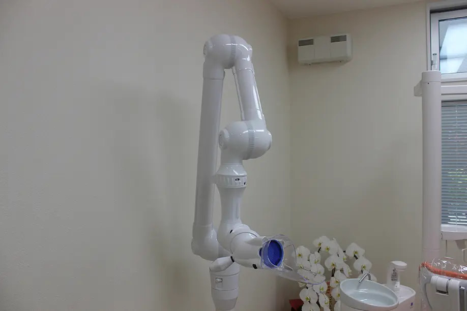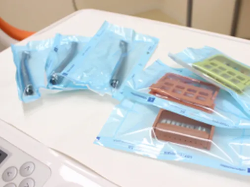 院内感染のリスクを減らすため、当院は衛生管理を怠りません。例えば、治療に使用した器具は患者さまごとに交換し、高圧蒸気滅菌器で滅菌処理をしています。その後、器具は滅菌パックに入れたまま保管し、治療前に患者さまの目の前で開封します。 また、清潔な環境で治療を行えるよう、診療室に空気清浄機を設置しました。チリなどを除去したクリーンな空気にできるので、快適に治療を受けられると思います。さらに、歯の粉塵や血液などが飛び散らないように、口腔外バキュームも導入しました。 院内感染防止を徹底していますので、心配なさらずにお口のお悩みをご相談ください。