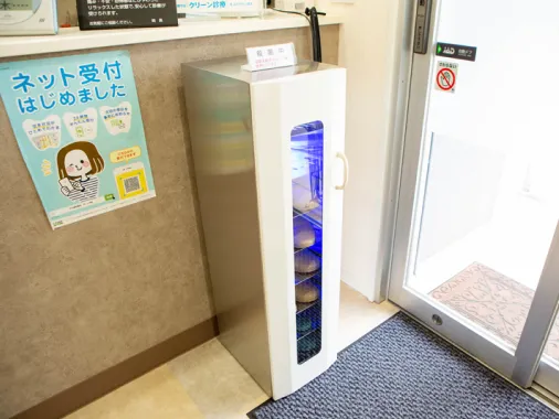 当院では、新型コロナウイルスなどの感染症対策を念頭に、殺菌スリッパケースを設置しております。紫外線を照射してスリッパに付着した病原菌を殺菌しているので、清潔なスリッパをお使いになれます。